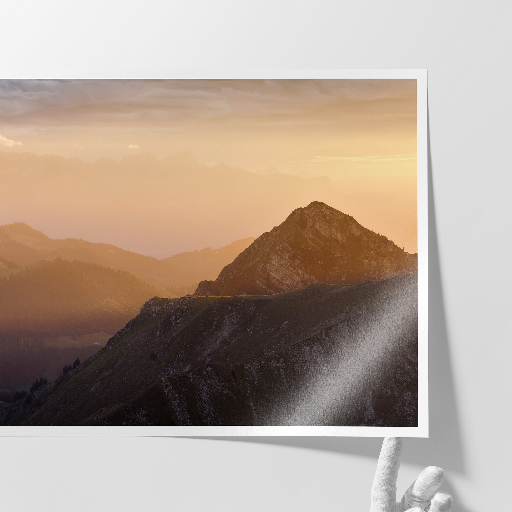 In this high-detail, high-resolution fine art piece, the foothills at the east end of Lac Léman are framed by the steep, rocky sides of Teysachaux on the right and the flowing grassy slopes of Dent de Lys on the left.