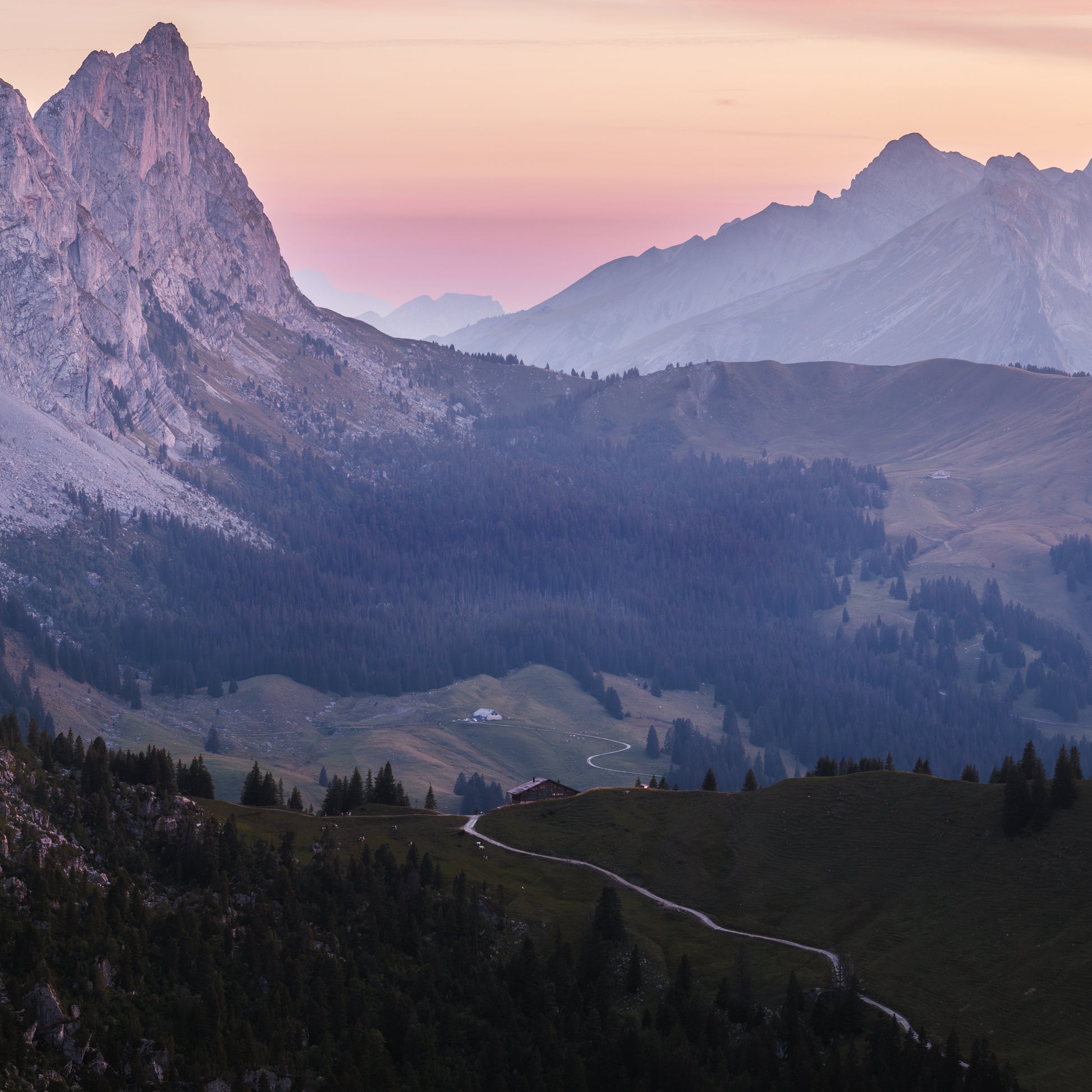 Captured on a calm, warm autumn evening, Soldat Sunset is a panoramic study of the Gastlosen, Vanil Noir (the highest peak of the Fribourg Canton) and Hochmatt in Switzerland’s Fribourg region. The Chalet du Soldat, a popular and familiar mountain hut in this region, sits at the centre of the image, marked by the access track that winds up from the bottom of the valley.